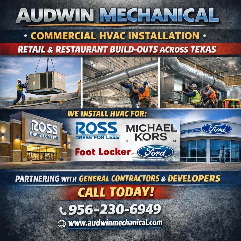Audwin Mechanical provides turnkey mechanical systems for general contractors, architects, city municipalities, developers, and commercial clients throughout the State of Texas.